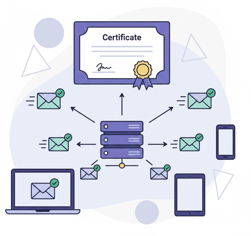 Send certificates instantly after your event, or issue them in bulk with a single click — each one complete with a secure, verifiable link attendees can proudly share anywhere.