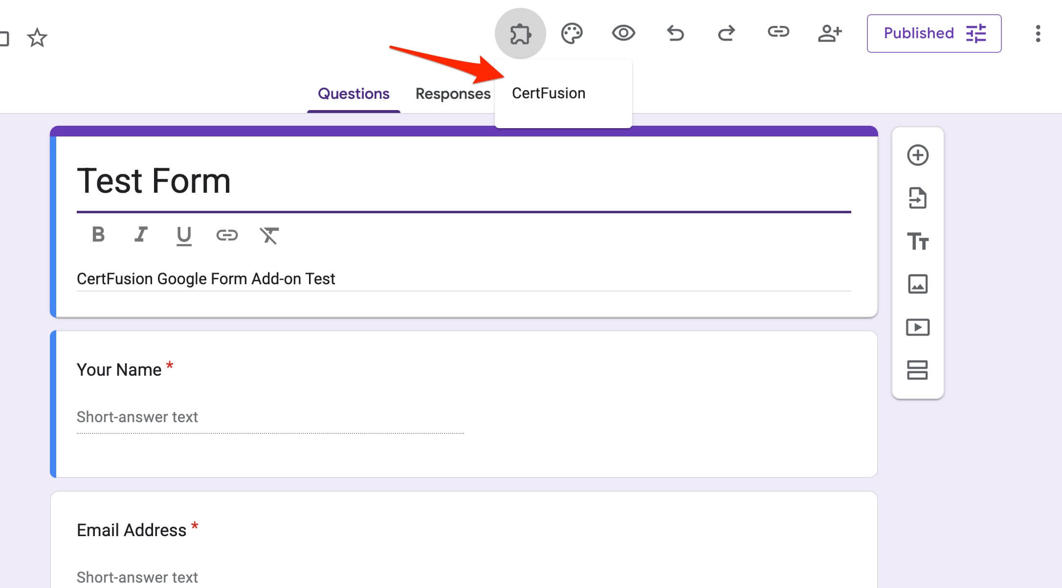 Once installed, you'll see the CertFusion menu in your form editor toolbar.