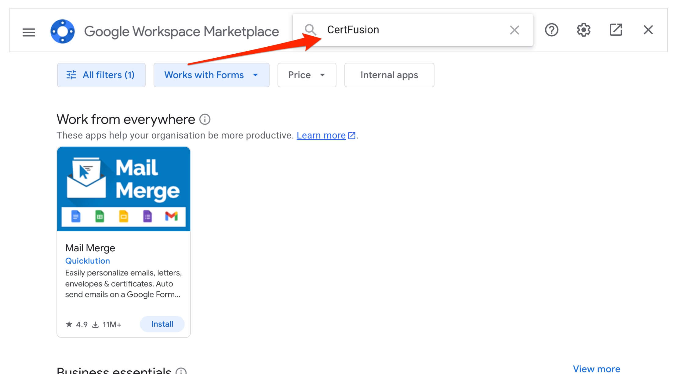 Search for CertFusion in the Google Workspace Marketplace and install the