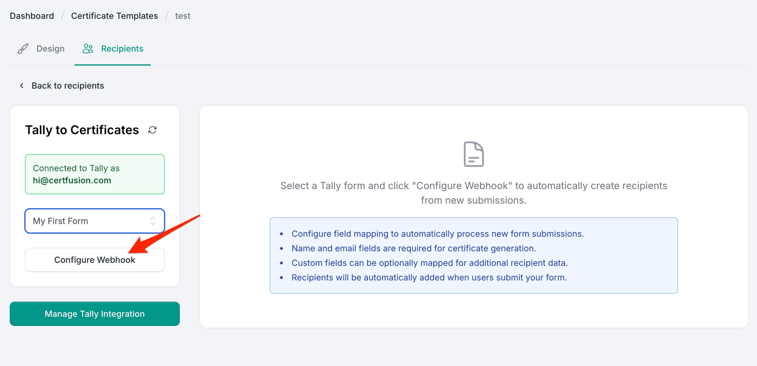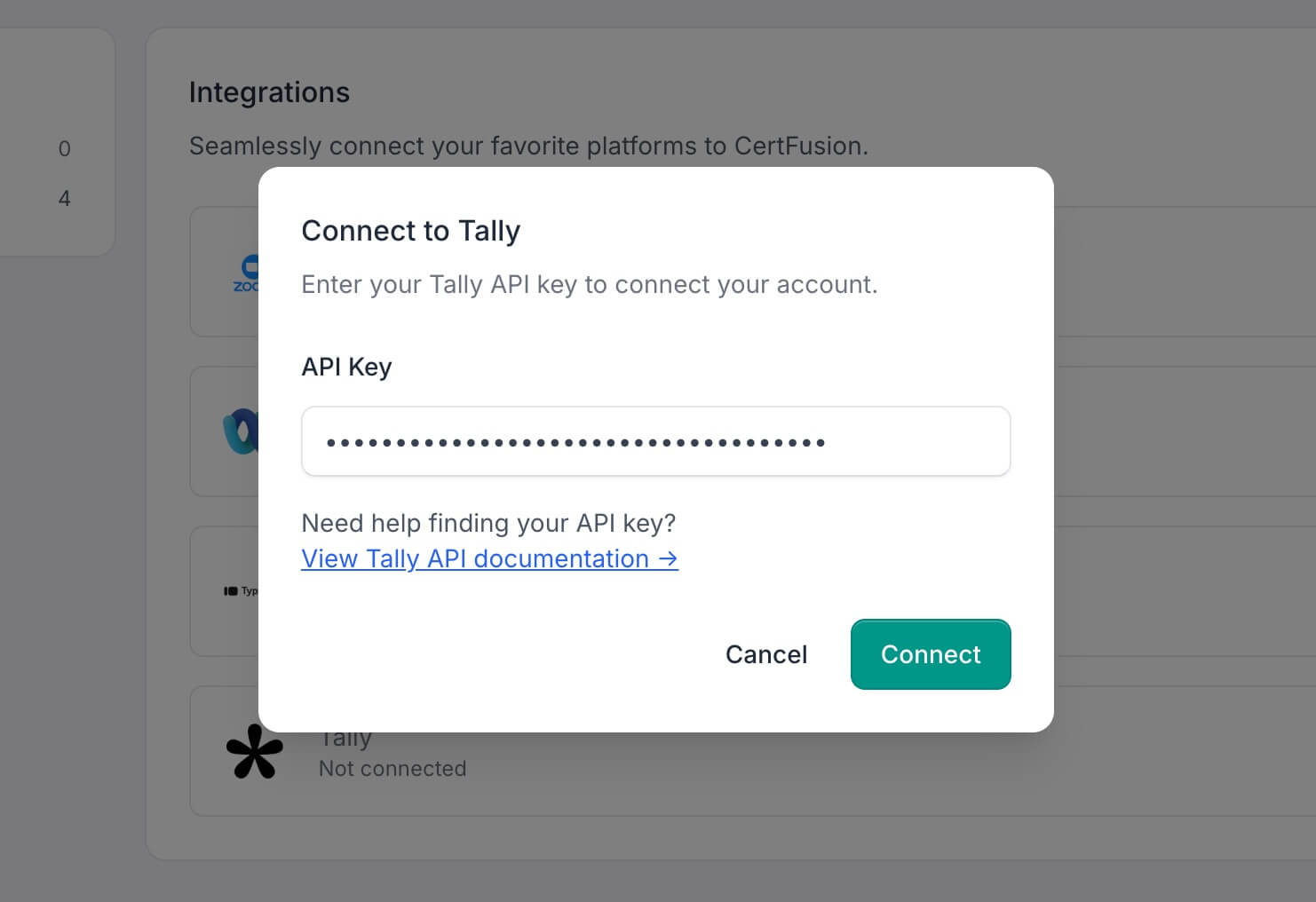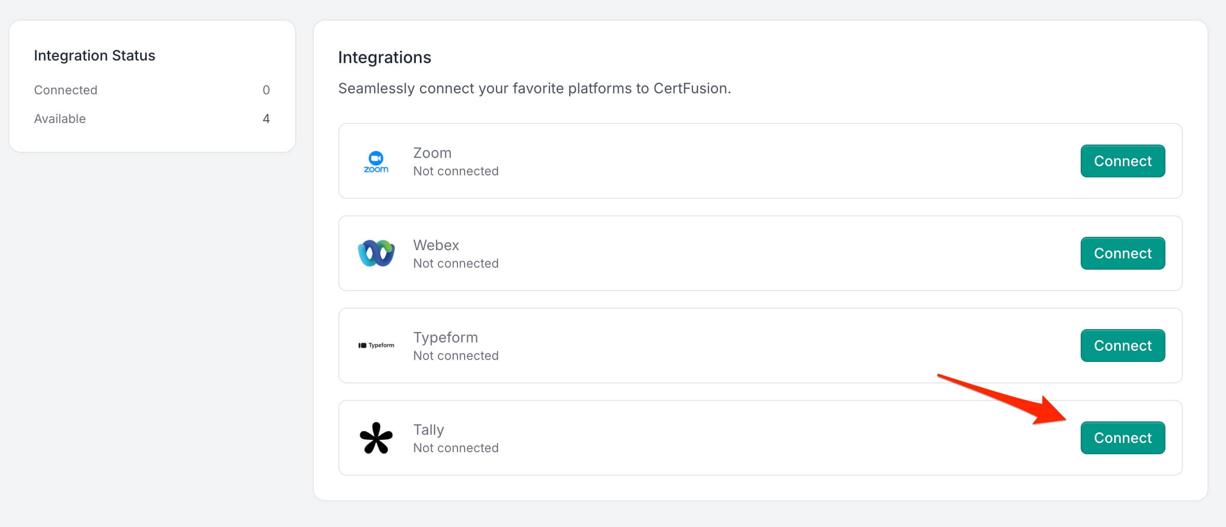 Connect your Tally account to CertFusion and automate certificate delivery for your form submissions.