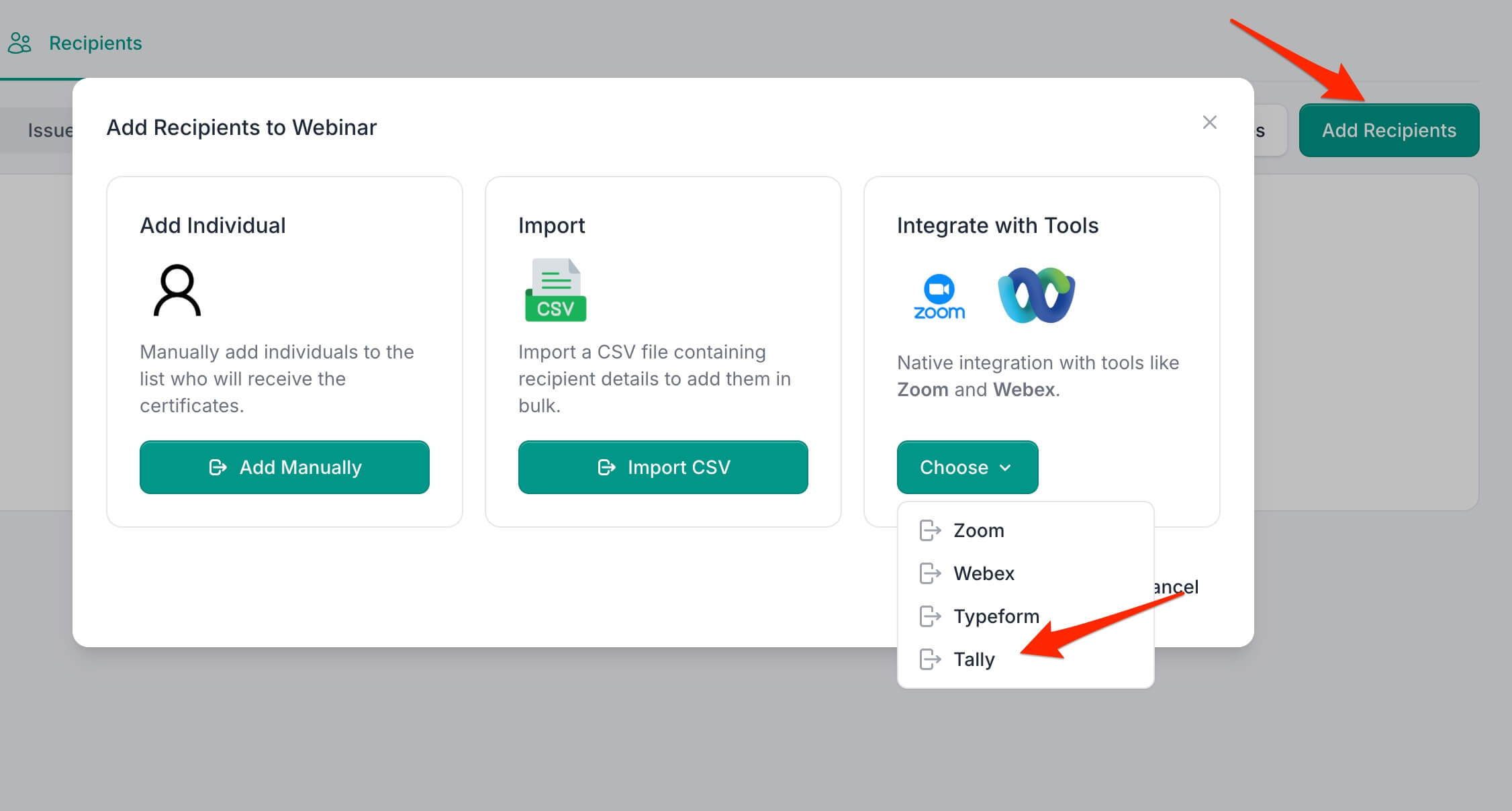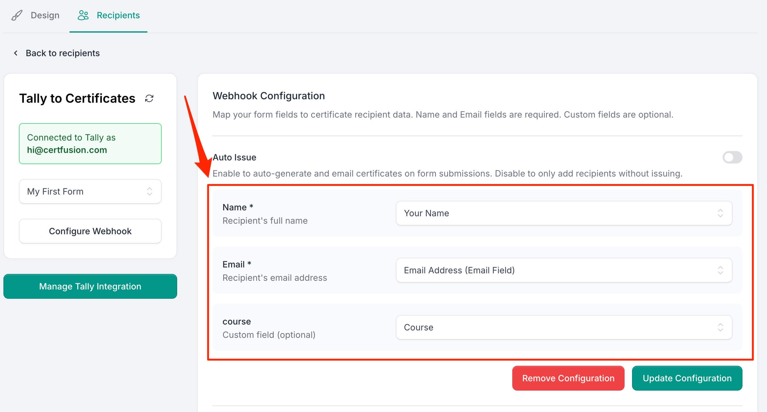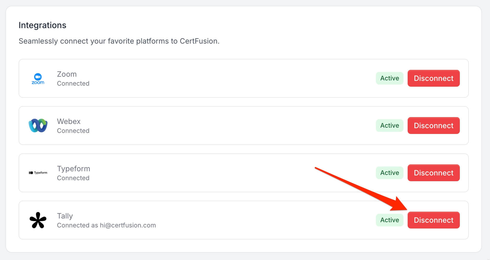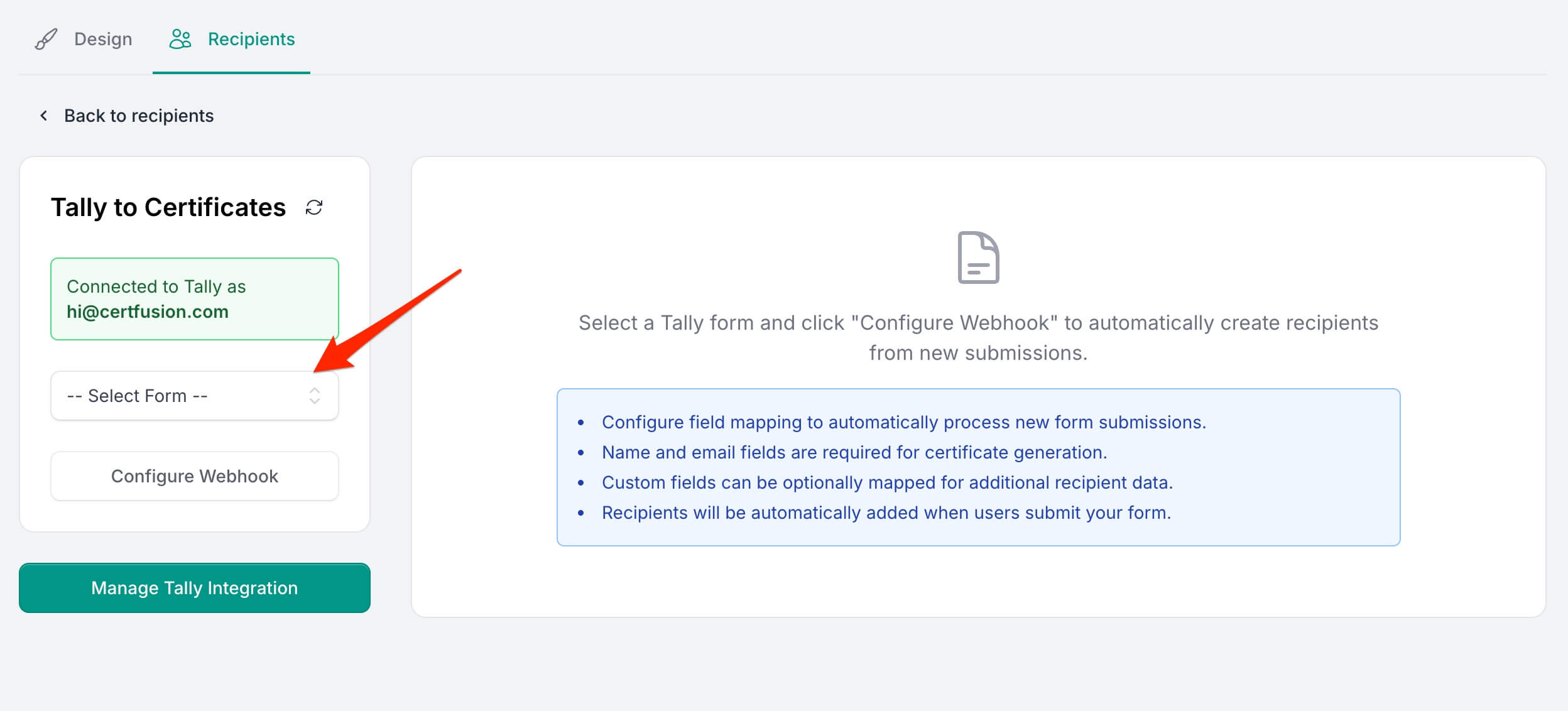 Connect your Tally account to CertFusion and automate certificate delivery for your form submissions.