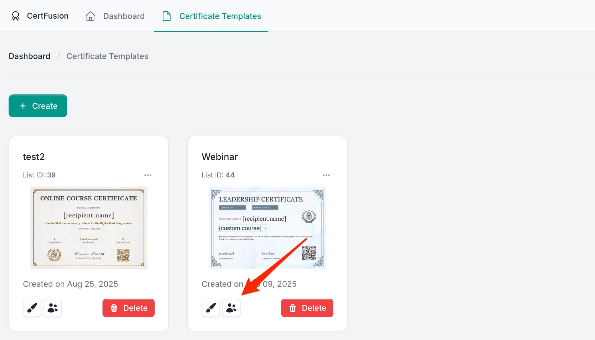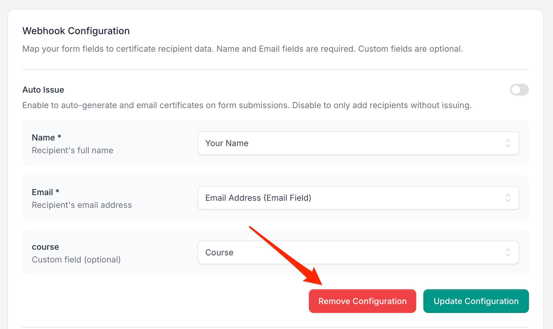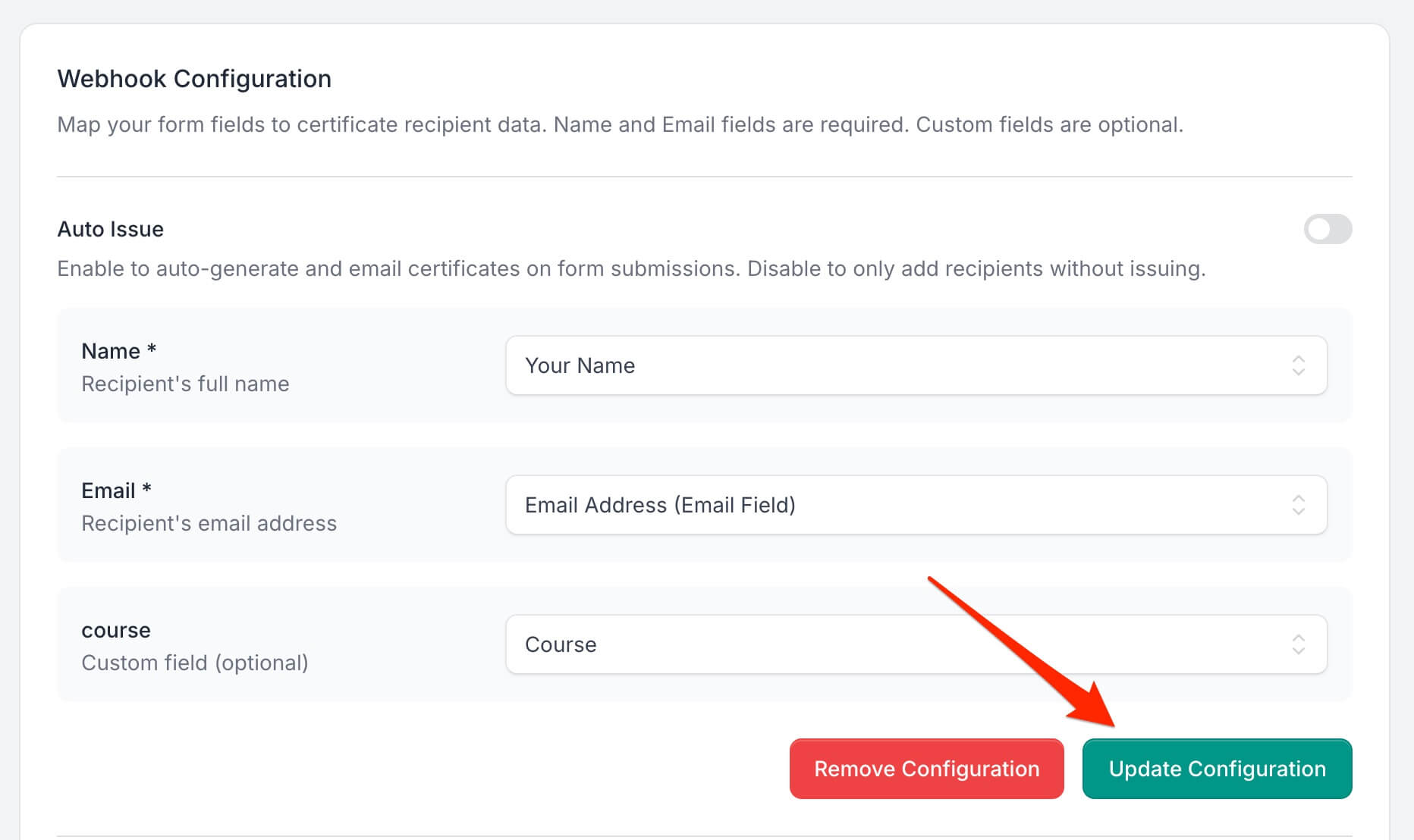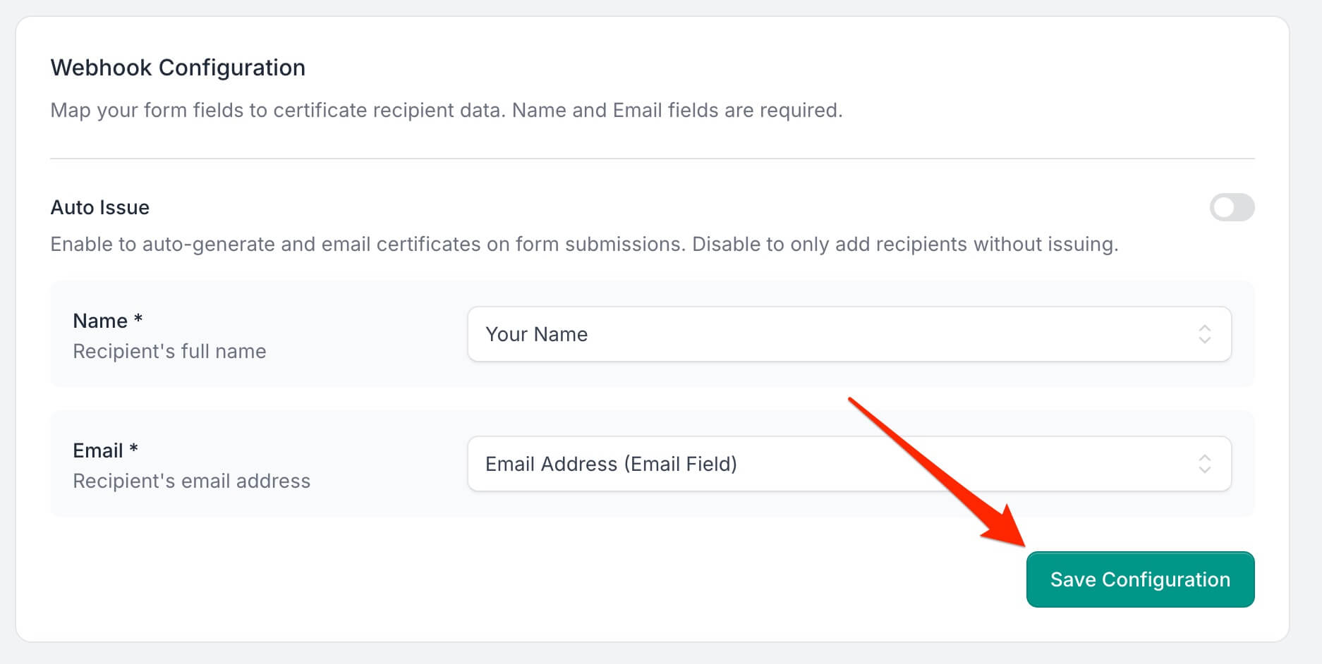Once configured, new form submissions will automatically create certificate recipients. If auto-issue
